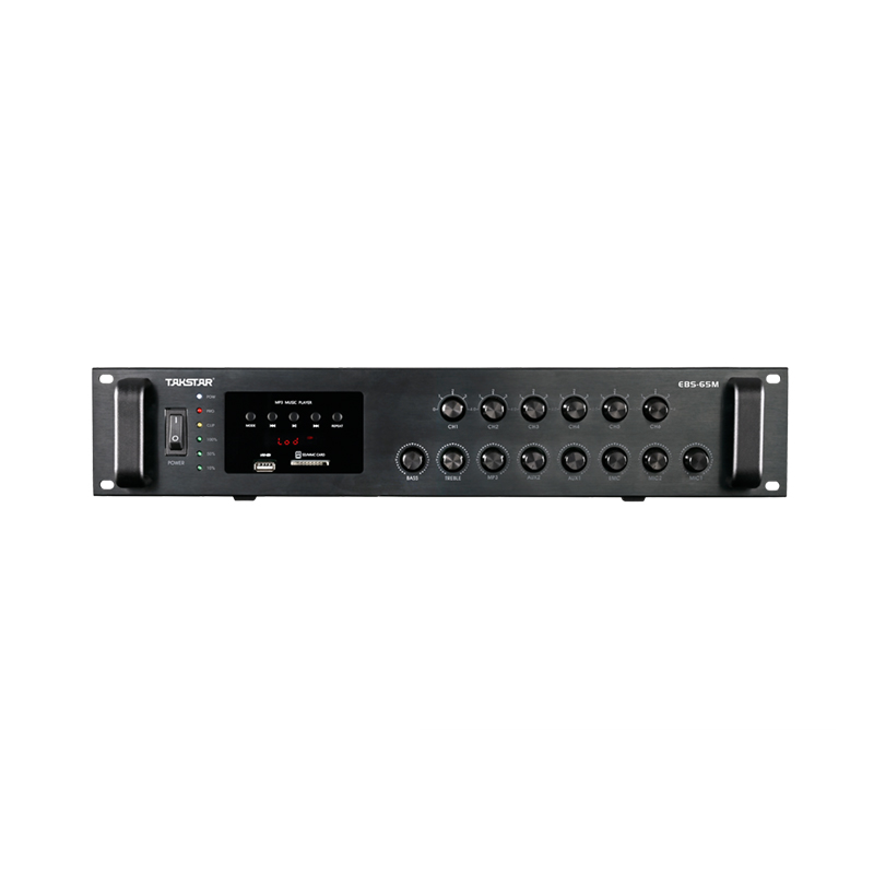 EBS-65M Takstar - amply thông báo 6 vùng loa với công suất tổng lên tới 650W. Amply có sẵn mô-đun phát nhạc MP3 qua bluetooth hoặc USB và hỗ trợ loa trở kháng cao (70V / 100V). Ứng dụng chủ yếu trong phát nhạc, thông báo tại nhà hàng, nhà máy, siêu thị..