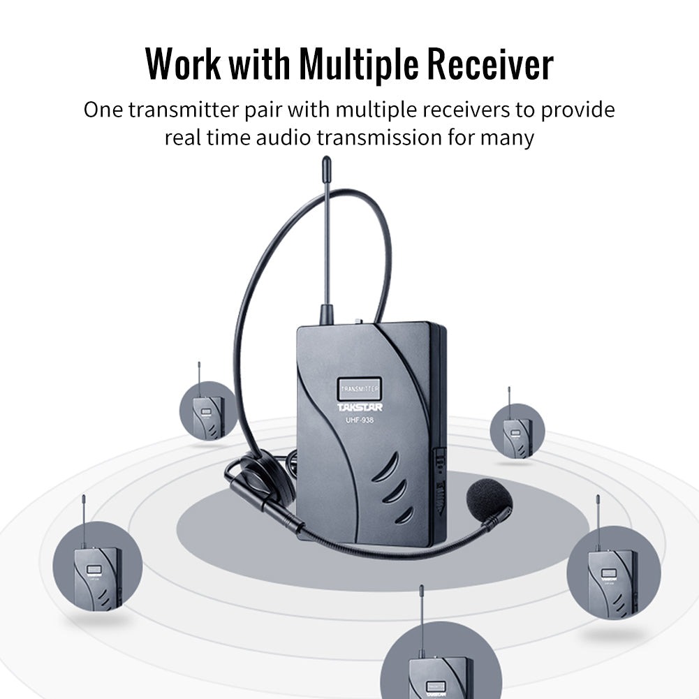 UHF-938T Takstar - Bộ phát cho người nói trong Hệ thống phiên dịch không dây của Takstar chuyên sử dụng cho hướng dẫn viên, thông dịch viên trong các cuộc họp quốc tế, hướng dẫn tour.... Thiết bị cần kêt hợp với bộ thu UHF-938R (có thể sử dụng nhiều bộ thu) để tạo thành một hệ thống hoàn chỉnh